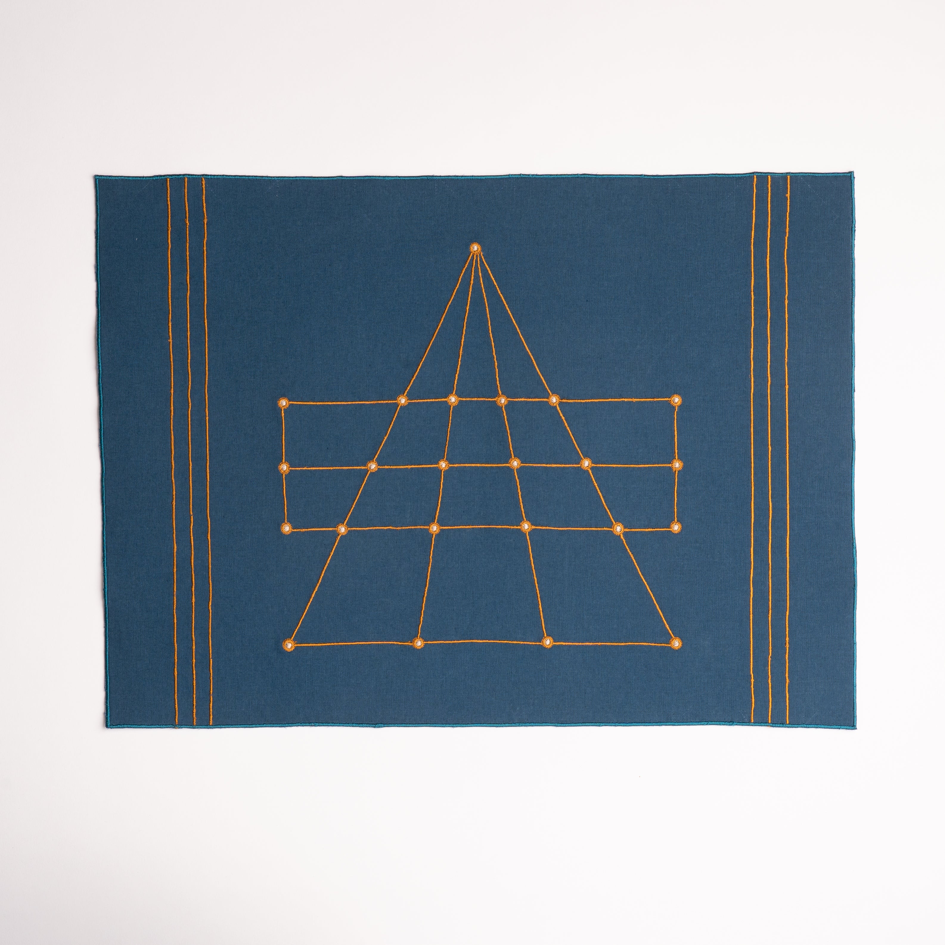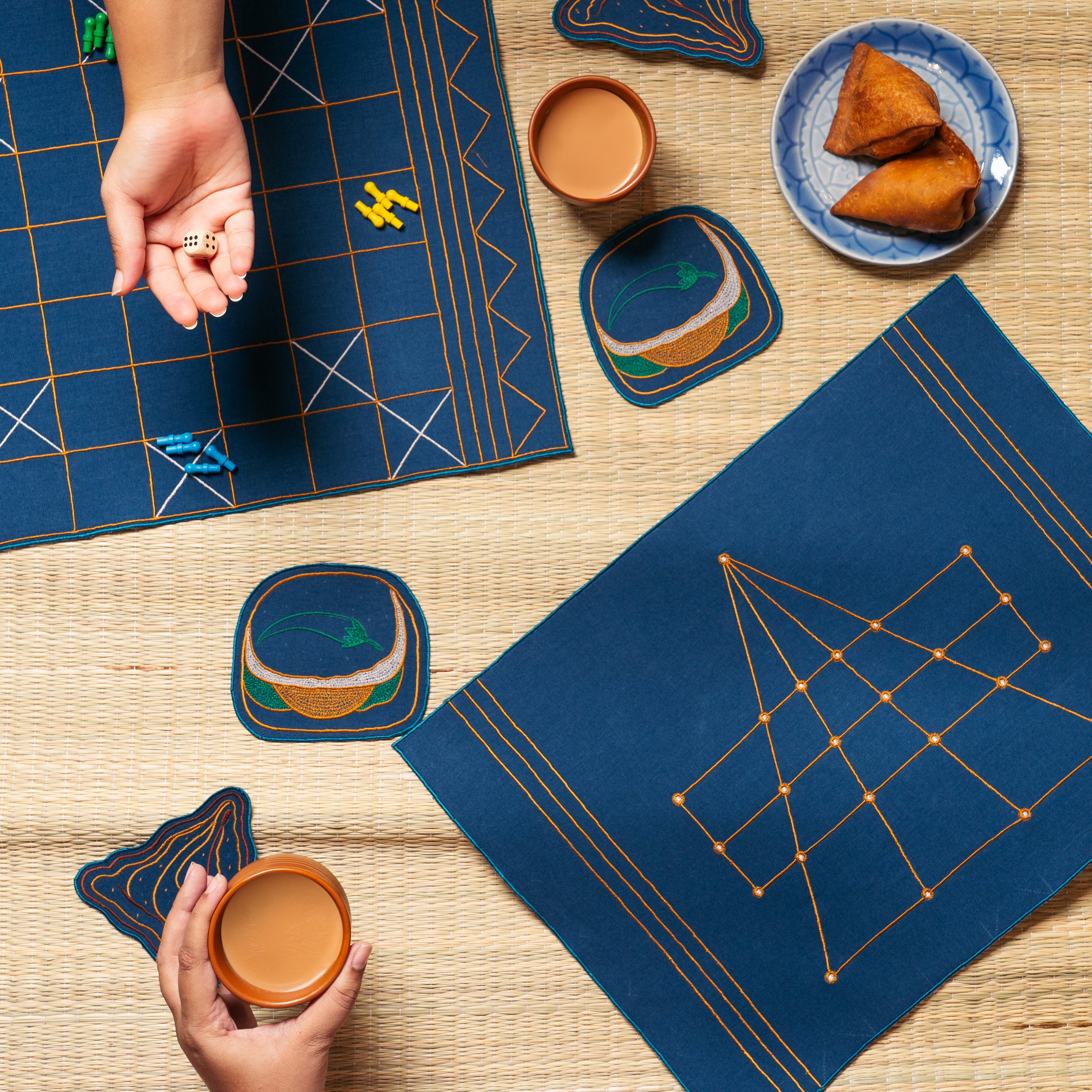 This elegant table mat features intricate embroidery inspired by Indian board games, adding a unique and artistic touch to your dining space. Made from a durable cotton blend, it provides a soft yet sturdy finish, ensuring both comfort and long-lasting use.