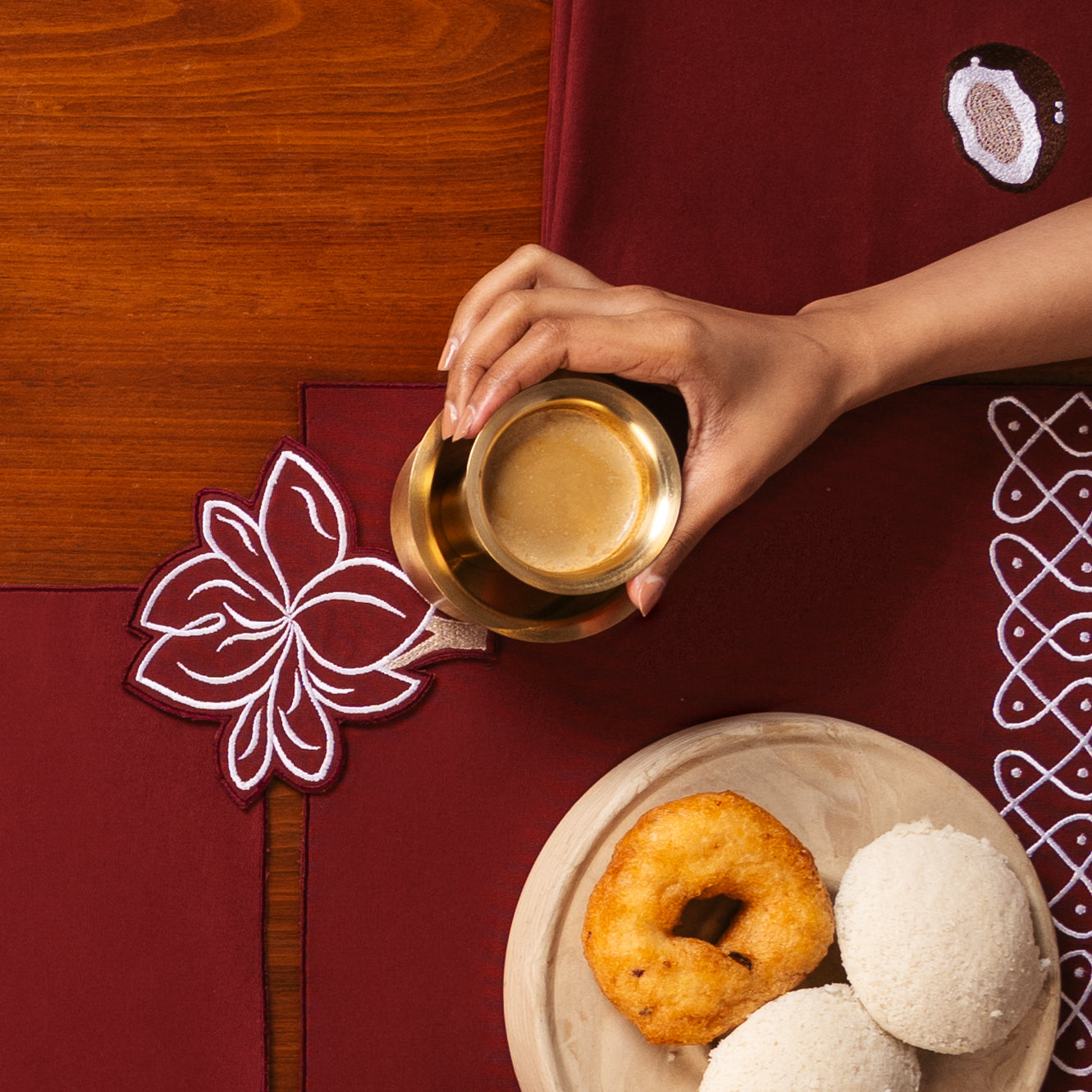 These elegant dinner napkins feature intricate white embroidery inspired by South India, adding a traditional and artistic touch to your dining space. Made from a durable cotton blend, they provide a soft yet sturdy finish for long-lasting and practical use.