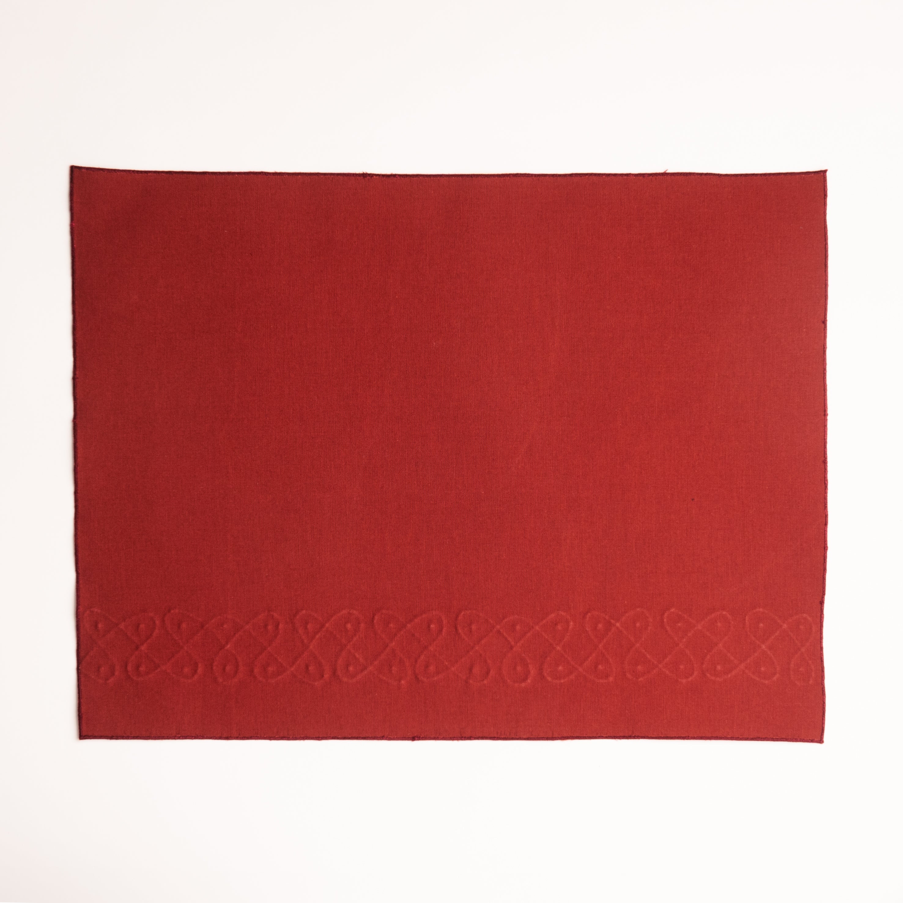 The deep red background with striking white threadwork creates a classy contrast, making it a vibrant addition to any table setting. Ideal for dining tables, coffee tables, or festive occasions, this handcrafted mat enhances the overall décor of your home.