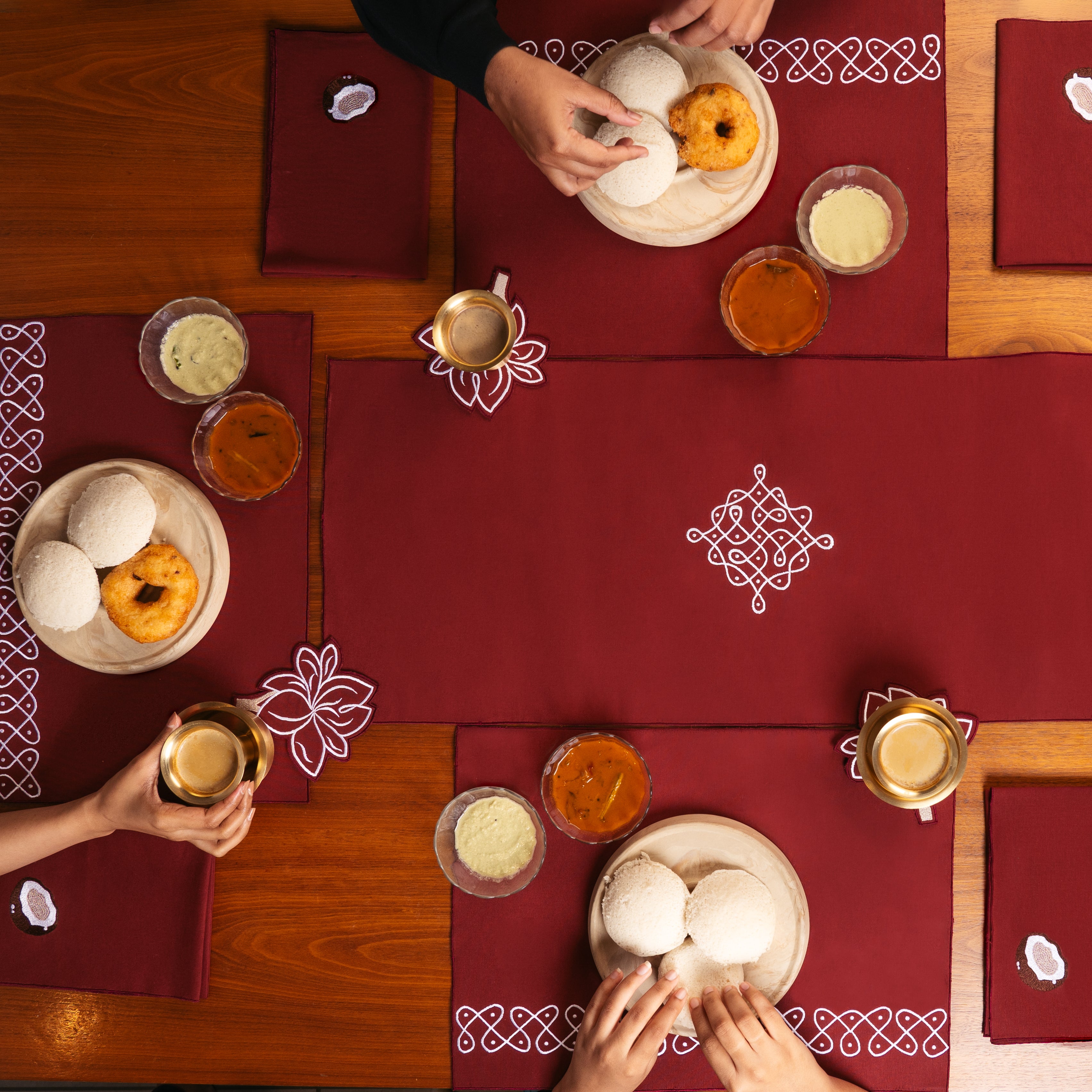 This elegant table runner features intricate white embroidery inspired by traditional Kolam patterns, adding a timeless and artistic touch to your dining space. Made from a durable cotton blend, it provides a soft yet sturdy finish for long-lasting and practical use.
